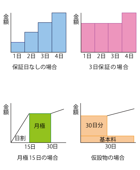 - レンタル料金の計算は原則として出庫日より入庫日迄とします。保証日数の設定があるものは、保証日が優先されます。例えば、使用料金が「3日保証」の場合、1日又は2日使用の場合でも、3日分のご請求となります。